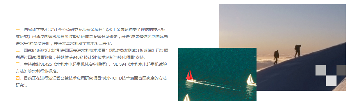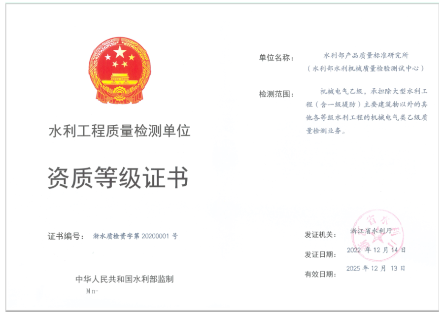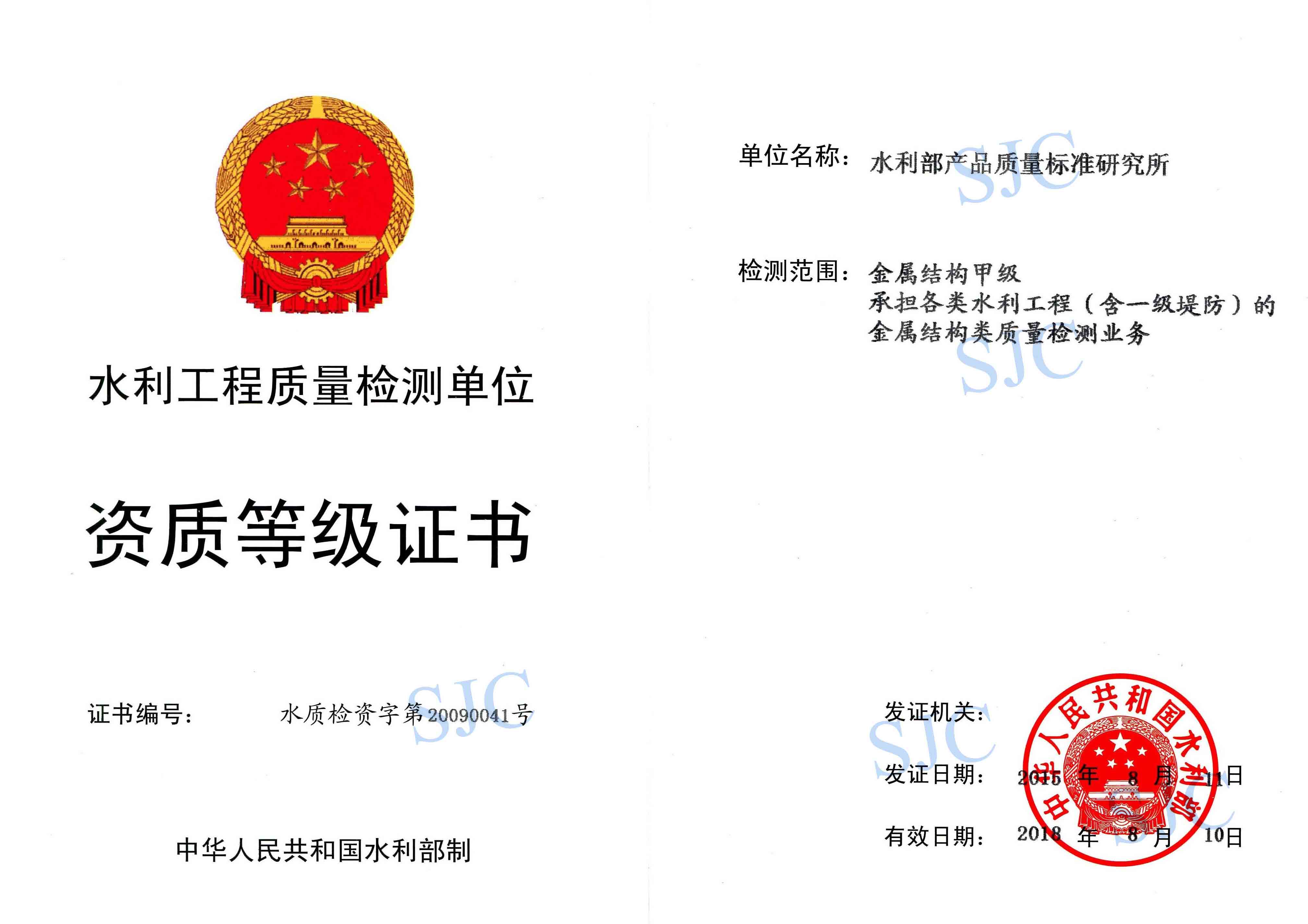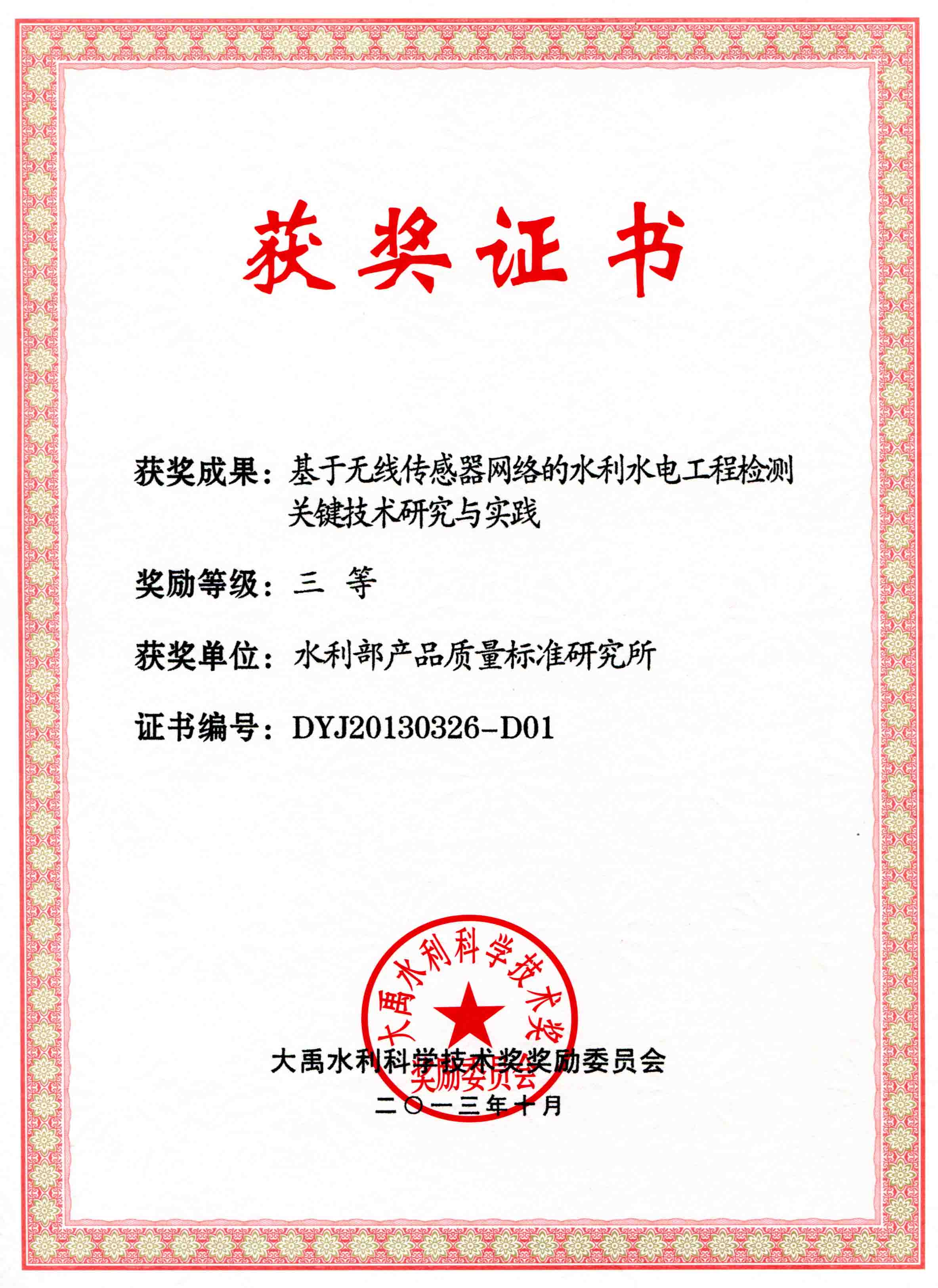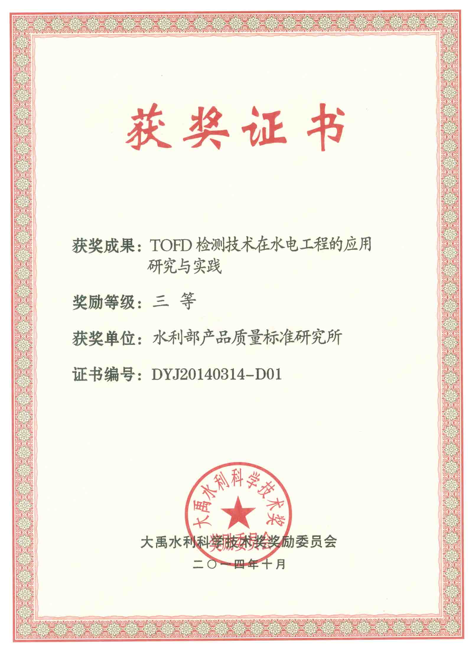 檢測中心在國內水工閘門及啟閉機械、壓力鋼管系統安全檢測評估領域處于技術領先地位。檢測中心主持完成的國家科學技術部“社會公益研究專項資金項目”《水工金屬結構安全評估的技術標準研究》已通過國家級項目驗收暨科研成果專家會議鑒定,獲得“成果整體達到國際先進水平”的高度評價,并獲大禹水利科學技術獎二等獎。《無線傳感器網絡在水電工程測試中的技術研究與應用》獲大禹水利科學技術獎三等獎。《TOFD檢測技術在水電工程的應用研究與實踐》獲2014年水利部綜合事業局昆侖科技獎二等獎和2014年大禹水利科學技術獎三等獎。檢測中心主持完成國家948科技計劃“引進國際先進水利技術項目”《振動模態測試分析系統》已經順利通過國家項目驗收,并繼續獲948科技計劃“技術創新與轉化項目”支持。