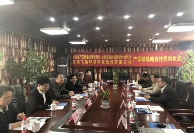 3月31日,水利部產品質量標準研究所(水利部杭州機械設計研究所)與蘇州飛馳環保科技股份有限公司在蘇州簽訂了《產學研戰略合作協議》。質標所劉德有所長和飛馳環保郭衛董事長親臨簽約現場,共同見證并進行了簽約儀式。