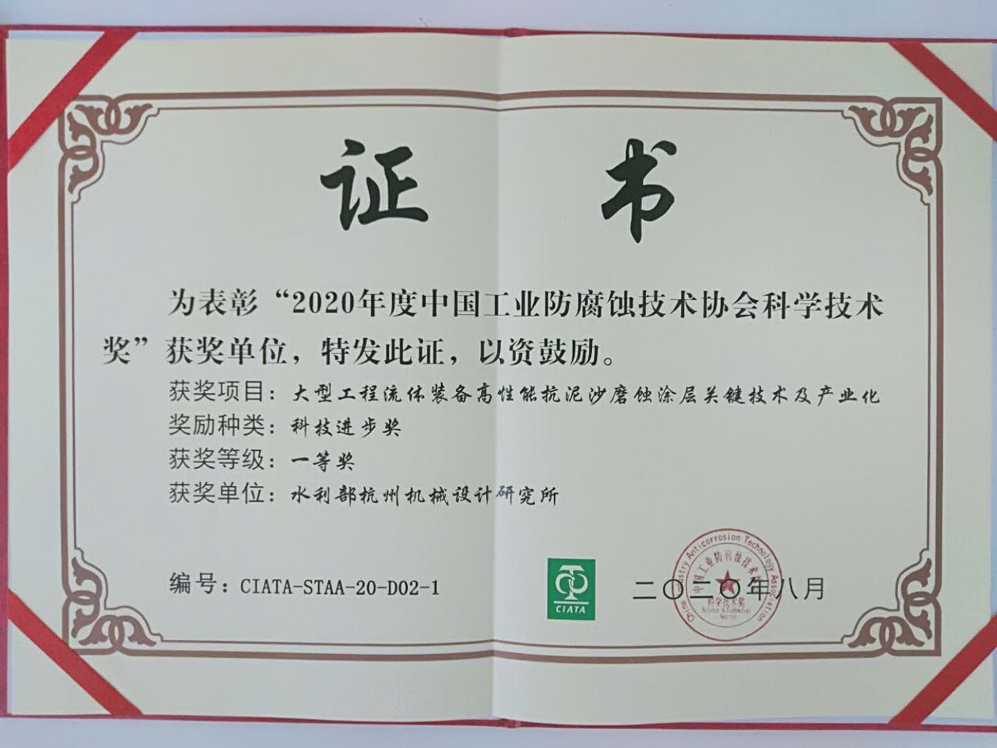 近日,中國工業防腐蝕技術協會頒發了“2020年度中國工業防腐蝕技術協會科學技術獎”,由水利部杭機所浙江省表面工程重點實驗室完成的“大型工程流體裝備高性能抗泥沙磨蝕涂層關鍵技術及產業化”項目榮獲“科技進步獎一等獎”。本次獲獎是我所重點實驗室繼2017年后再次獲得該重要獎項一等獎。