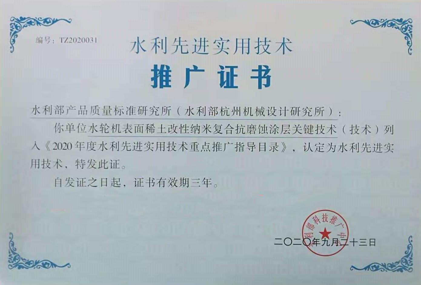 近日,水利部杭機(jī)所浙江省表面工程重點(diǎn)實(shí)驗(yàn)室“水輪機(jī)表面稀土改性納米復(fù)合抗磨蝕涂層關(guān)鍵技術(shù)”獲得水利部科技推廣中心頒發(fā)的“水利先進(jìn)實(shí)用技術(shù)推廣證書”,該技術(shù)目前已被列入《2020年度水利先進(jìn)實(shí)用技術(shù)重點(diǎn)推廣指導(dǎo)目錄》。
